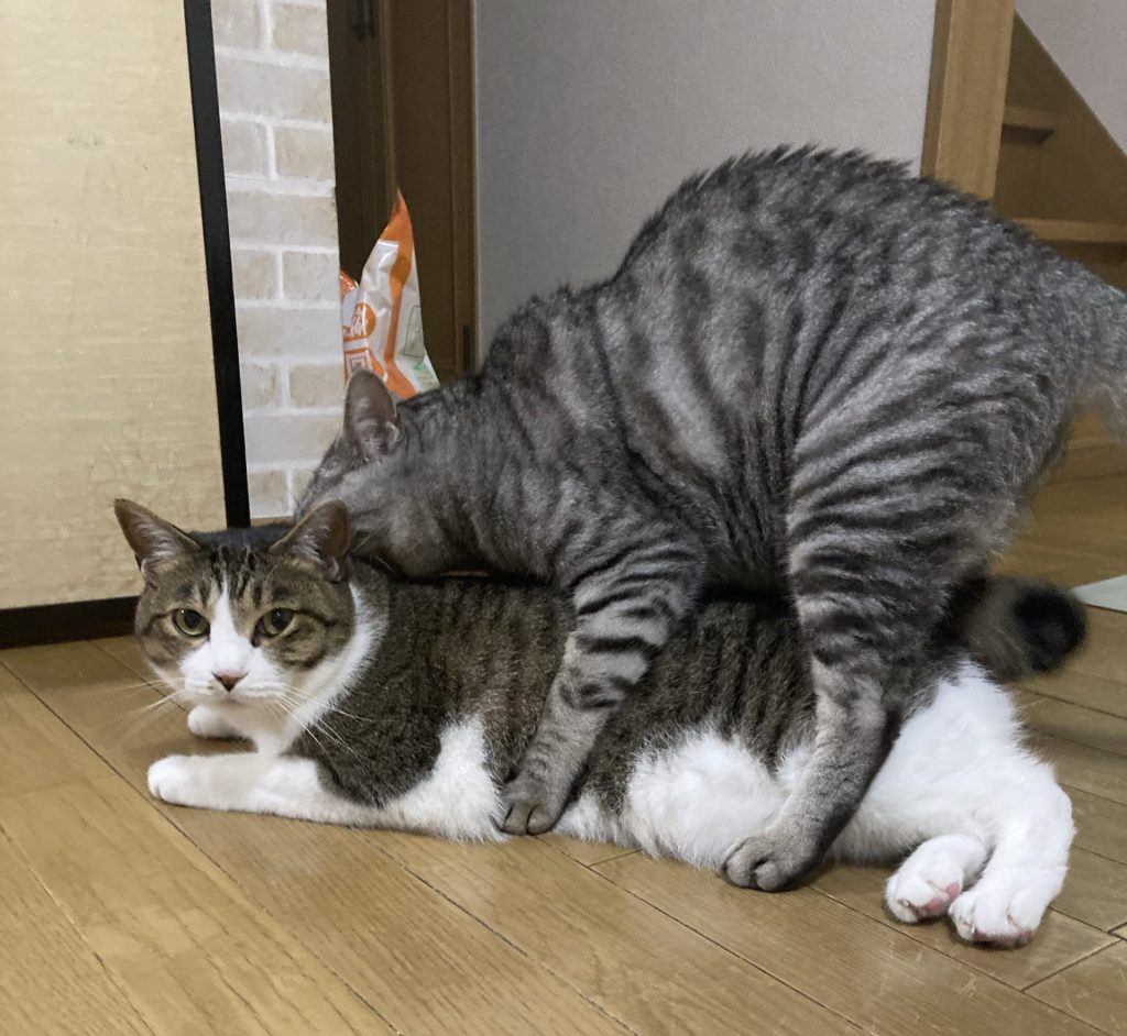 The other is a brown and black tabby (a “kijitora”).